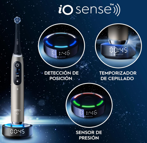 El iO Sense es el corazón tecnológico de este cepillo. Mediante un sistema de guía inteligente, el cepillo: