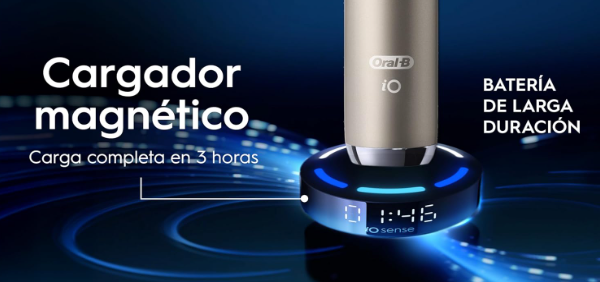 El Oral-B iO10 cuenta con un cargador magnético de alta velocidad, que asegura energía suficiente en poco tiempo. Este sistema no solo acelera la carga, sino que también proporciona una base estable y elegante para el dispositivo.